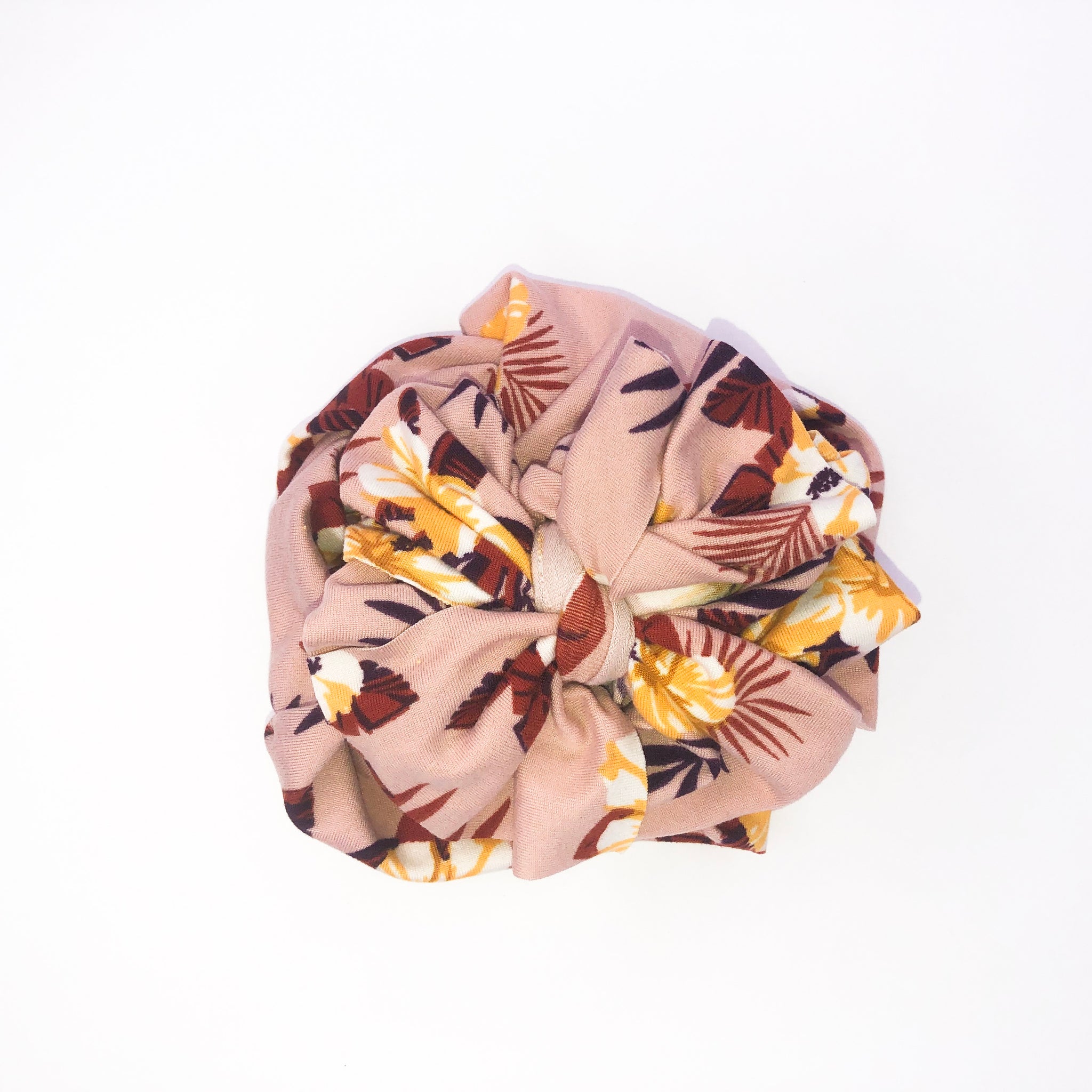 Royal yellow hibiscus and rust palms on dusty rose backdrop